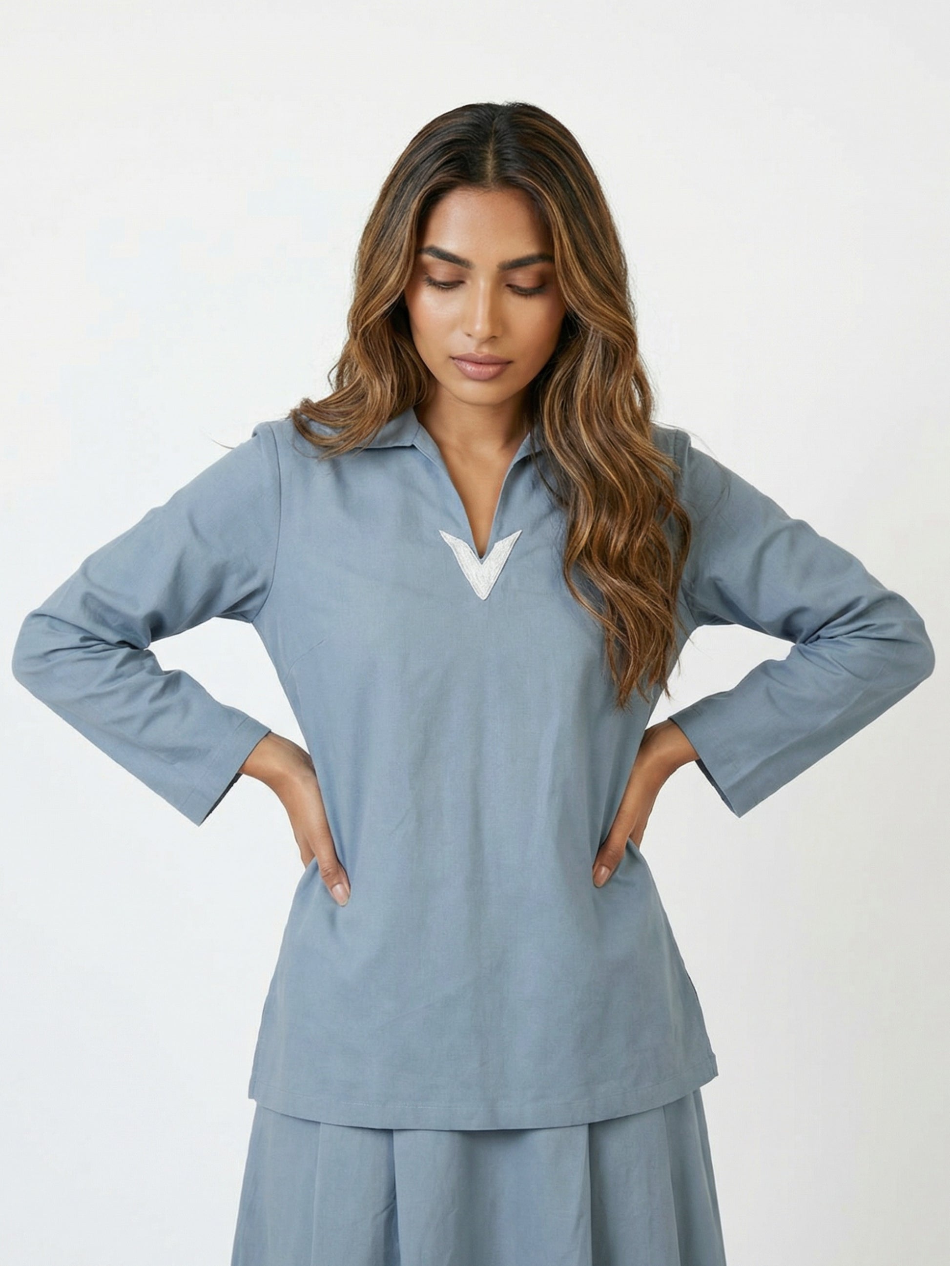 An easy-luxe co-ord set in a breathable linen-cotton blend, accented with artisanal hand-bead work. Perfect for elevated summer & monsoon days.