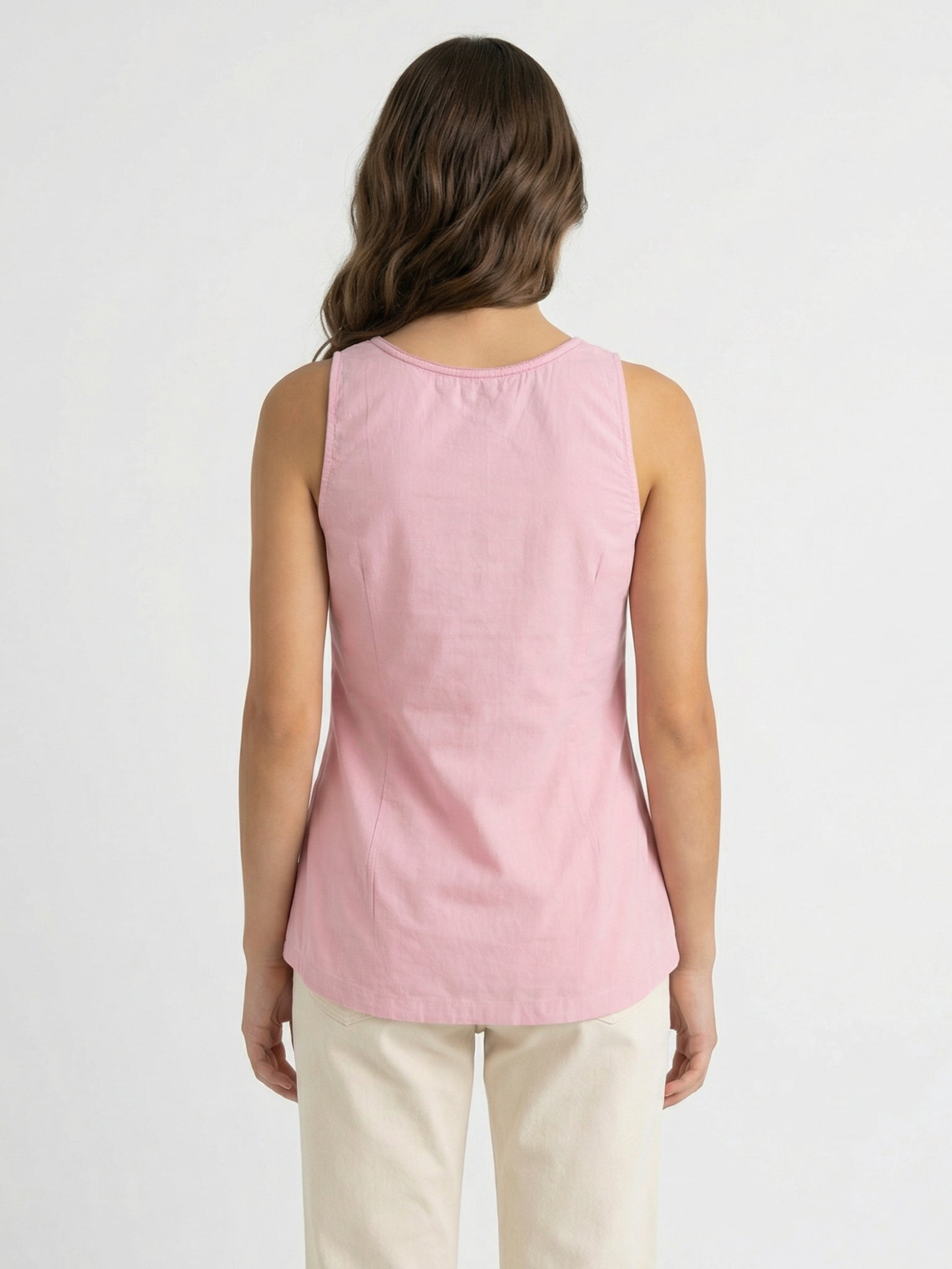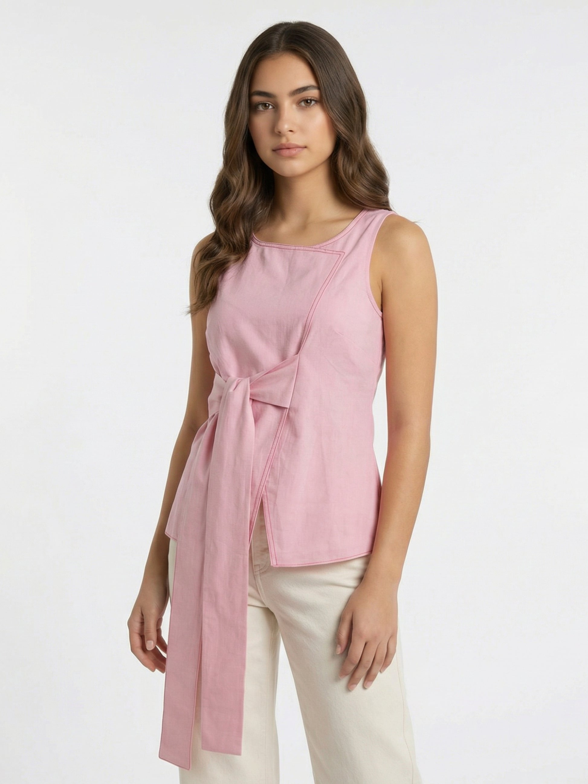 Crafted in soft, breathable cotton, this blush-toned top features a clean sleeveless silhouette with an elegant wrap-style overlay and statement side tie detail. Designed for comfort with a refined edge, it pairs effortlessly with tailored trousers or denim for versatile day-to-evening styling.