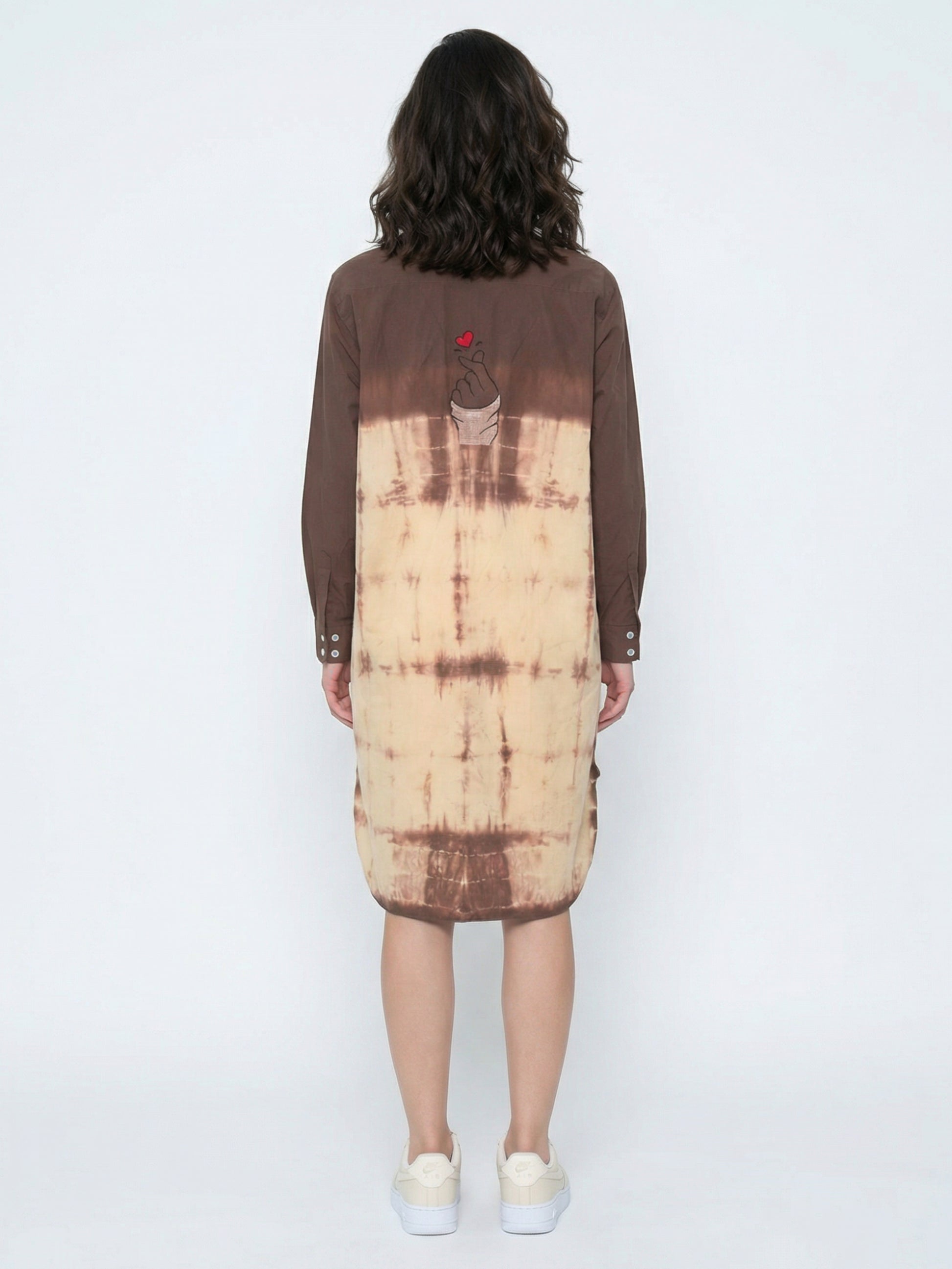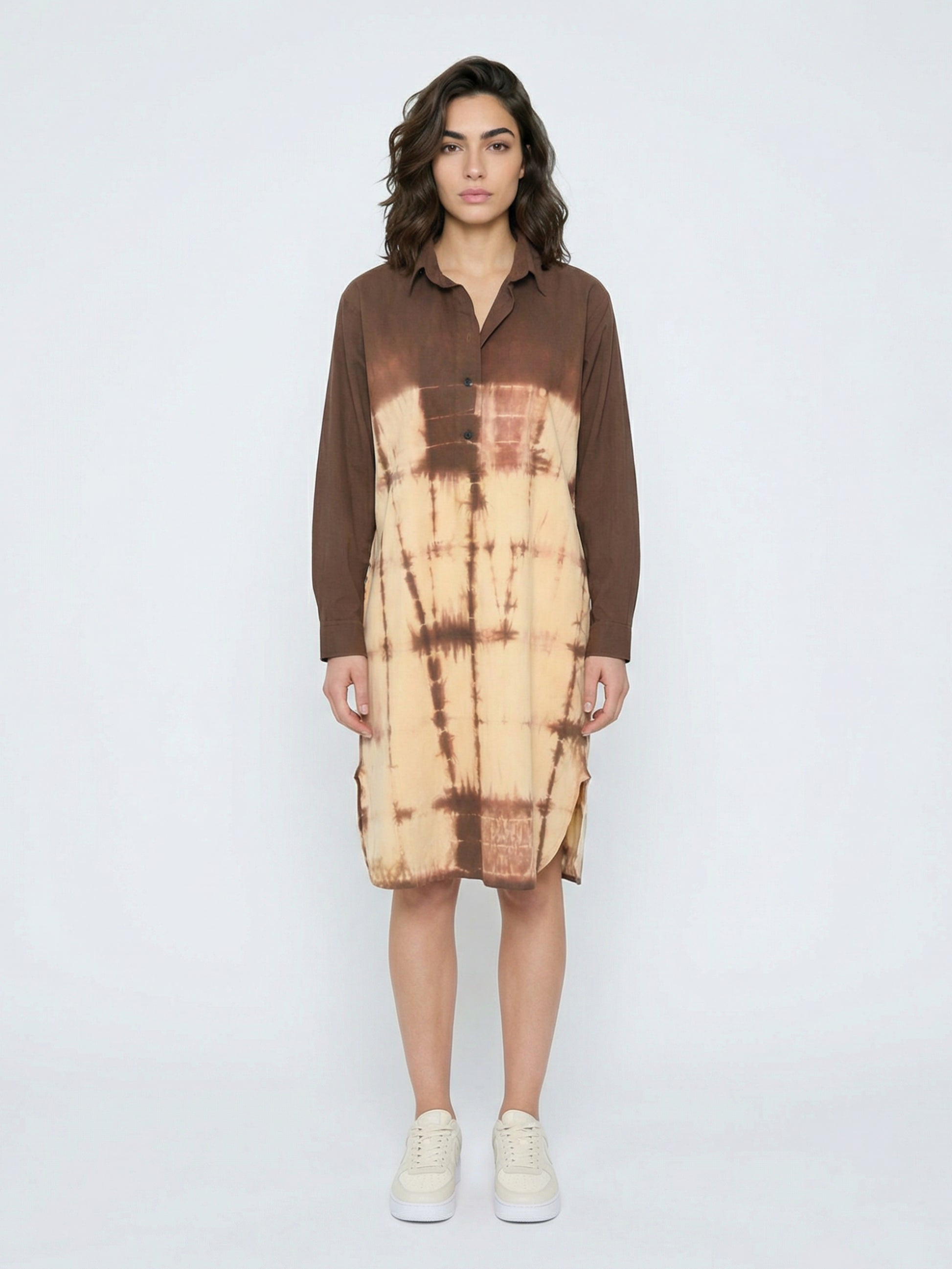 Crafted in soft, breathable cotton, the Mocha Mist Shirt Dress showcases a rich brown and ivory tie-dye blend. Designed with a relaxed silhouette and classic shirt collar, it offers effortless comfort with a warm, earthy charm—perfect for everyday elegance.