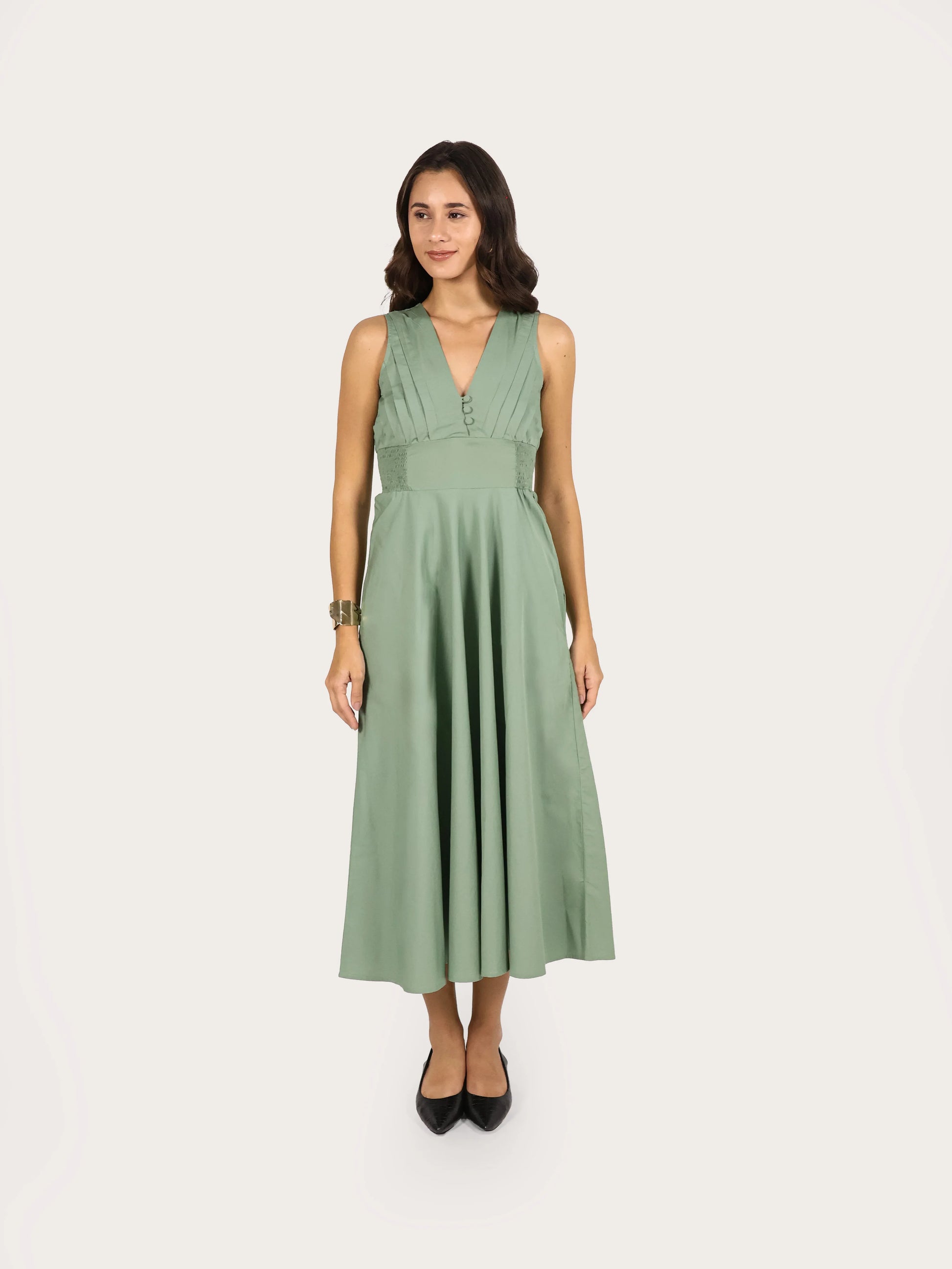 Serene Pleat Cotton Midi Dress – Sage Green