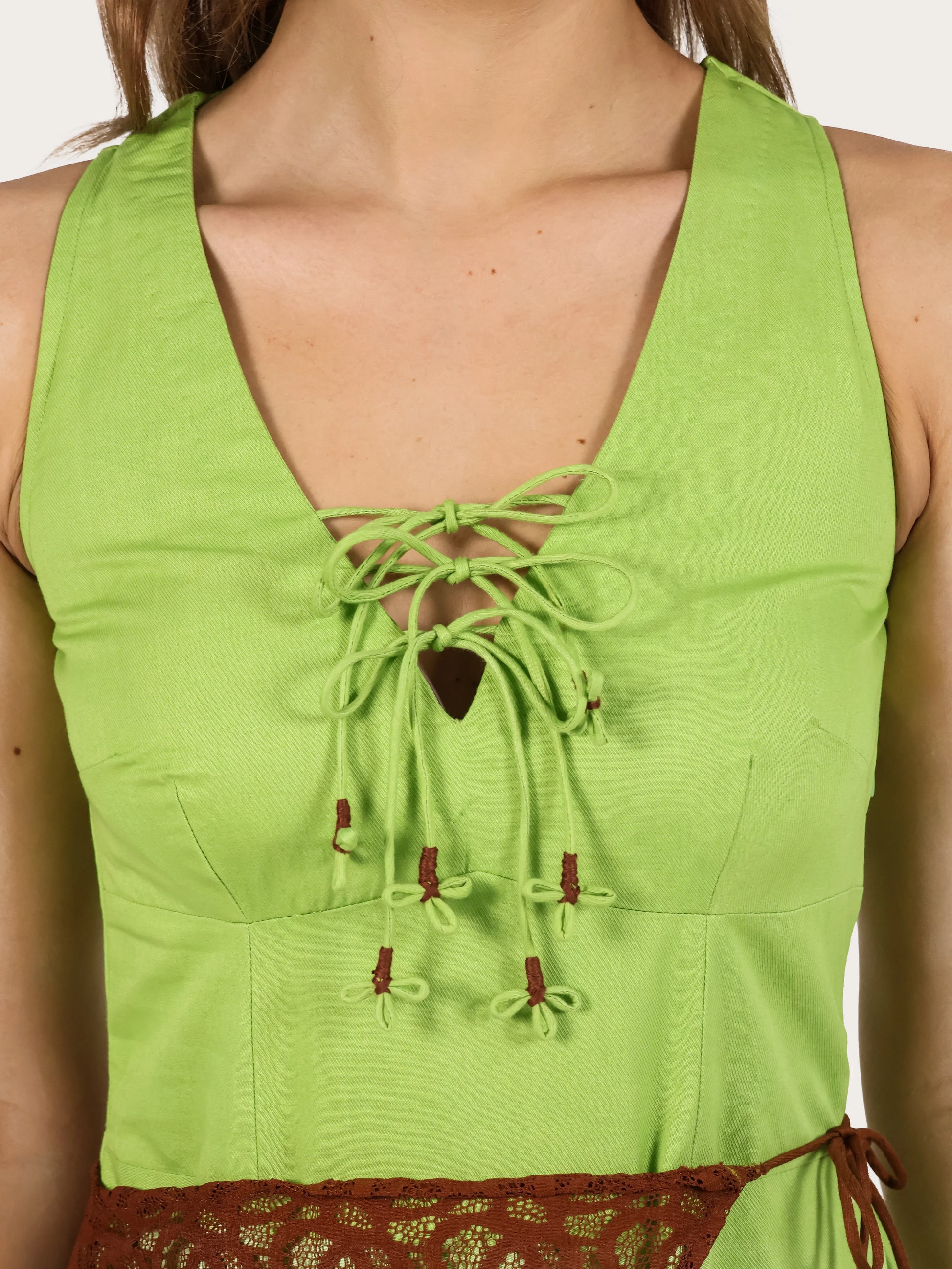A refreshing fusion of earthy tones and textures, this sleeveless dress is crafted in breathable cotton twill with a delicate net overlay. The lace-up bodice adds a playful detail, while the contrasting green and rust panels create a balanced yet striking look—perfect for casual outings with a touch of elegance.